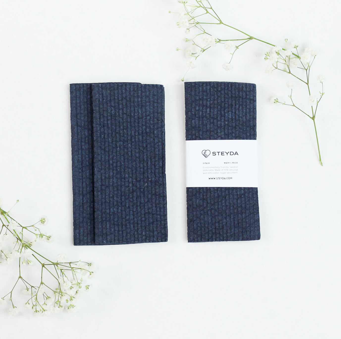 I detta set ingår tre marinblå trendriktiga disktrasor. Storlek ca 16,5x17,5 cm. De är färgade med miljövänliga GOTS-färger (Global Organic Textile standard).